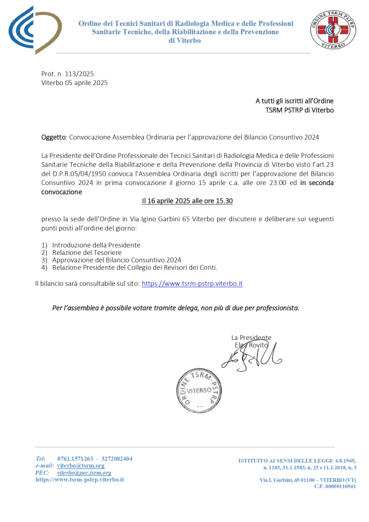 Convocazione assemblea ordinaria degli iscritti 16 aprile 2025